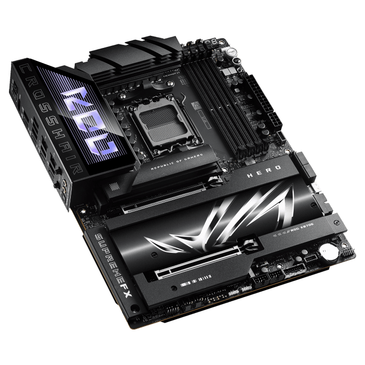 The ASUS ROG Crosshair X870E HERO ATX Gaming Motherboard delivers elite performance for AMD Ryzen™ 9000, 8000, and 7000 Series CPUs with advanced 18+2+2 power stages, DDR5 memory support, PCIe 5.0 slots, Wi-Fi 7, and USB4® connectivity. Designed for gamers, overclockers, and creators, it features AI-enhanced cooling, dynamic RGB lighting, and robust thermal solutions for next-gen PC builds.